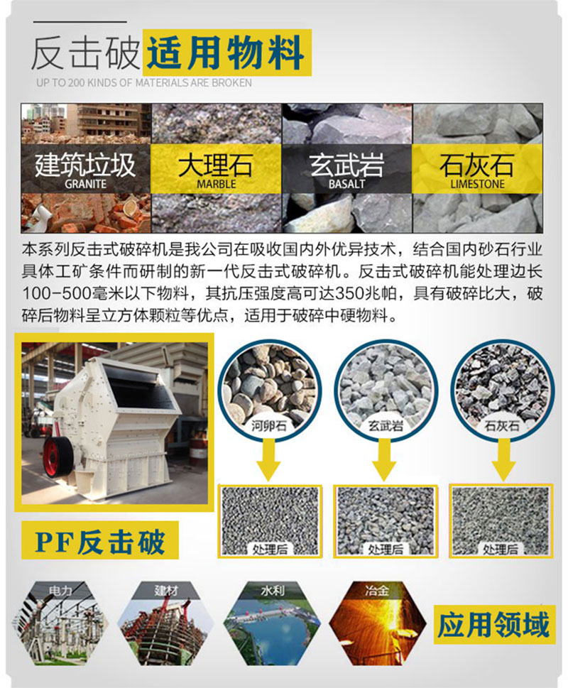 PF系列反擊式破碎機是利用沖擊能對抗壓強度不超過350Mpa的脆性物料進行破碎的設備,具有破碎比大、產品粒度均勻且過粉碎現象少、能耗低、產粒度調整范圍大、能選擇性破碎等優點,對中等硬度的物料進行中碎和細碎作業。